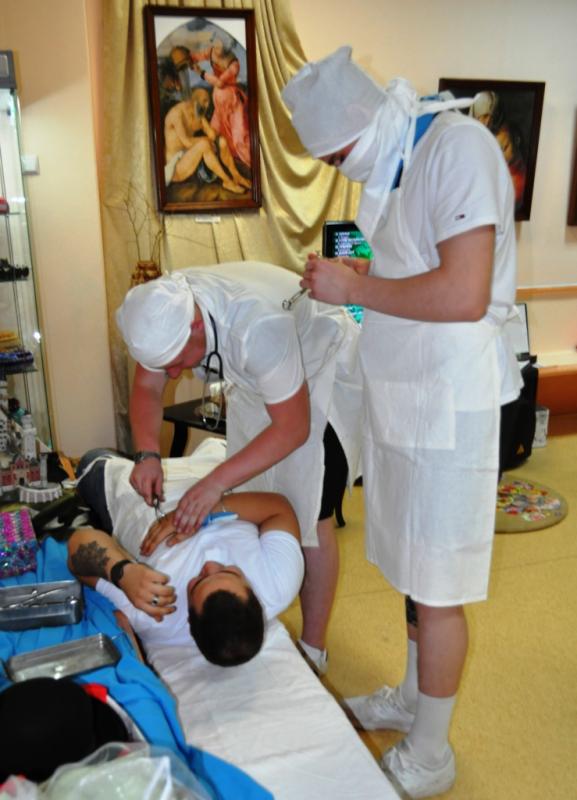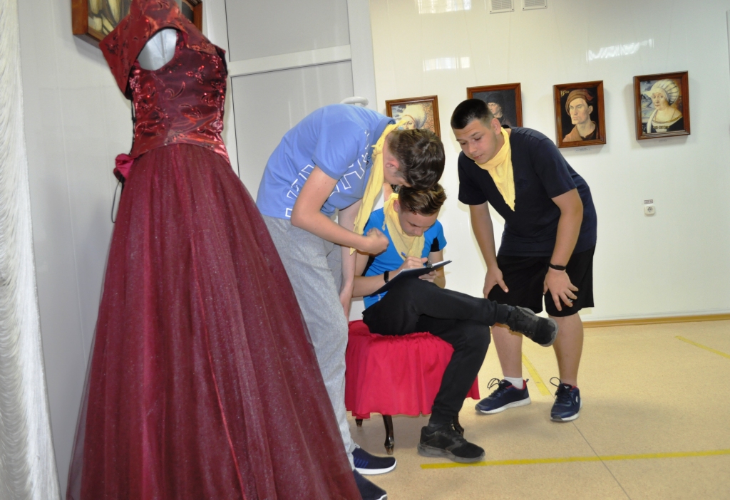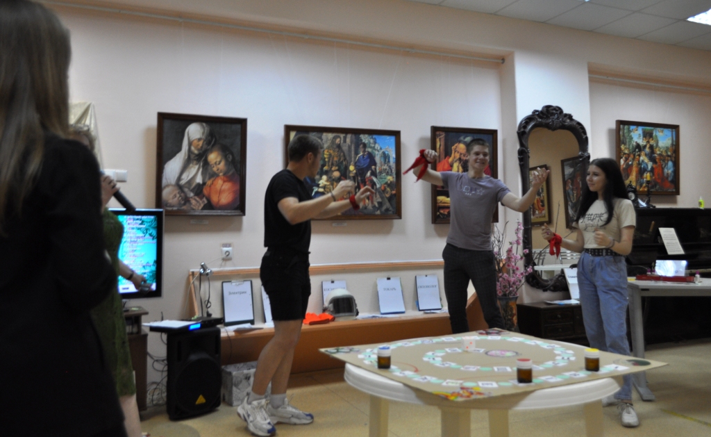 В это время в другом зале музея проходила интерактивная игровая программа «Все профессии важны». Экскурсовод музея Марина Ухина проводила шуточные соревнования между тремя командами. Ребята примеряли на себя роль хирургов, океанологов, визажистов, поваров, нянь и даже змееловов.
