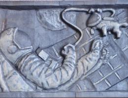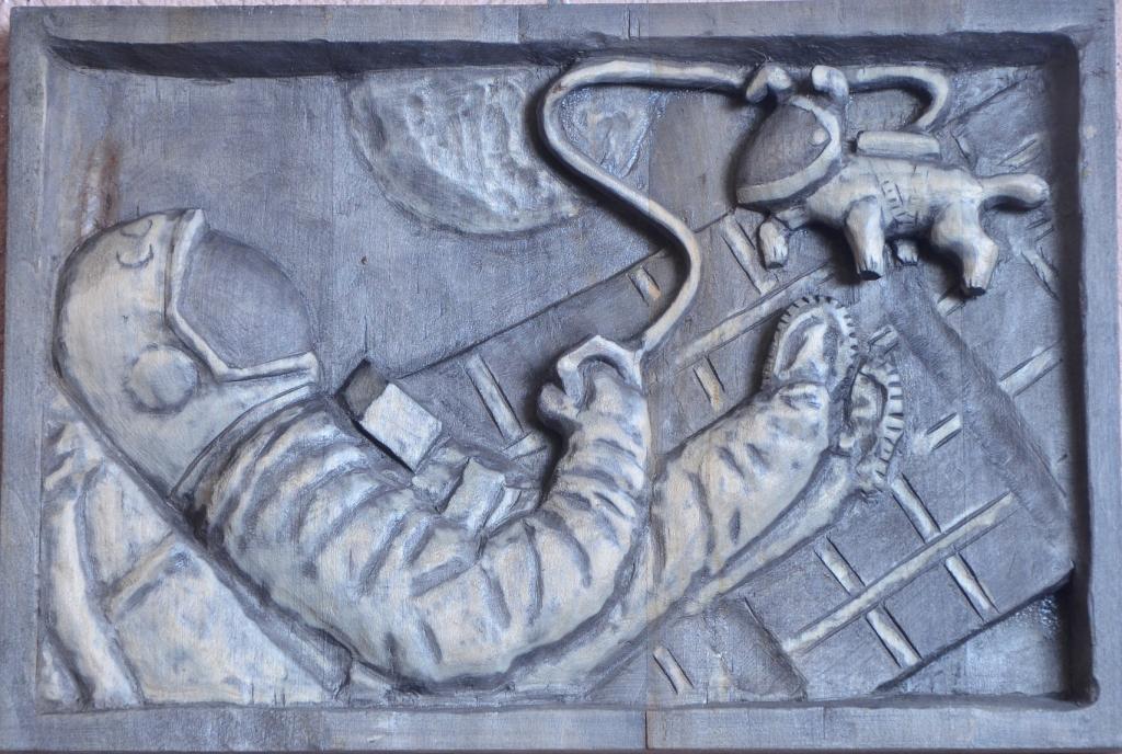 Панно «Первые покорители космоса». Илья посвятил панно 60-летию первого полета человека в космос. Шуточный сюжет о том, что и на Марсе человек может жить со своим другом - собакой. Илья режет на липе. Для обработки использует различные оттенки морилки.