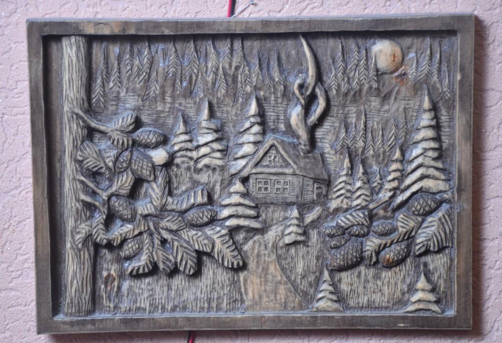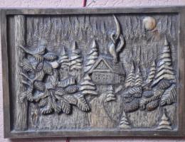 Панно «Родина». Красота природы родных мест, лунная зимняя ночь, дымок из трубы деревянного дома и тропинка, ведущая к дому. Все это говорит о любви автора к своей малой Родине, о желании отдохнуть душой здесь, в краю. родном
