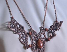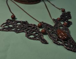 Гривна «Вересковый мед» и кулон «Вересковый мед». Гривна выполнена в технике гальваники, с обжигом, патинированием и шлифовкой. Состоит из трех частей, соединенных между собой бусинами. Материалы гривны: омедненные фрагменты бумаги для цветочных букетов, кабошон и бусины авантюрина, металлическая фурнитура. Название необычное. Авантюрин напоминает капли меда, а вереск - это символ бессмертия и молодости. Все понятия красиво объединились в названии «Вересковый мед».