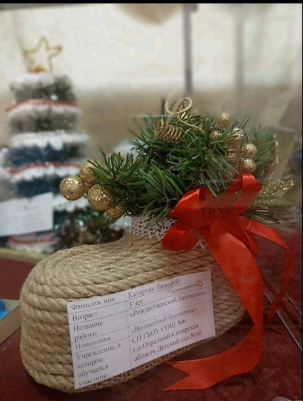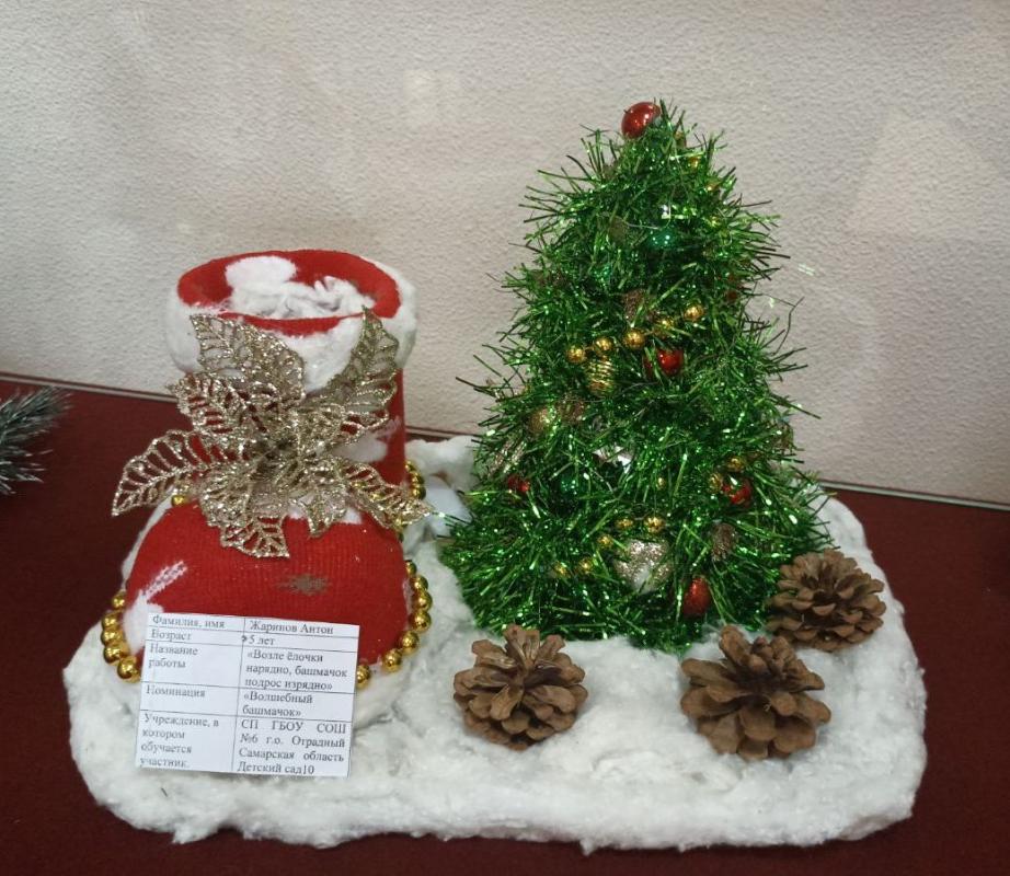 СП ГБОУ СОШ №10 «ОЦ ЛИК» детский сад №11 - активный участник выставки - конкурса. В номинации «Волшебный башмачок» награждены за 2 место Софронов Михаил с работой «Новогодний Башмачок» (рук. Рогалева Э.Н.). Такой своеобразный башмак со шляпой, а на шляпе взгромоздилась Ёлка!