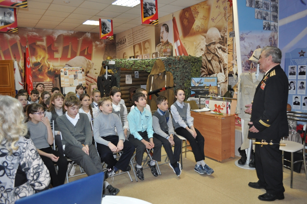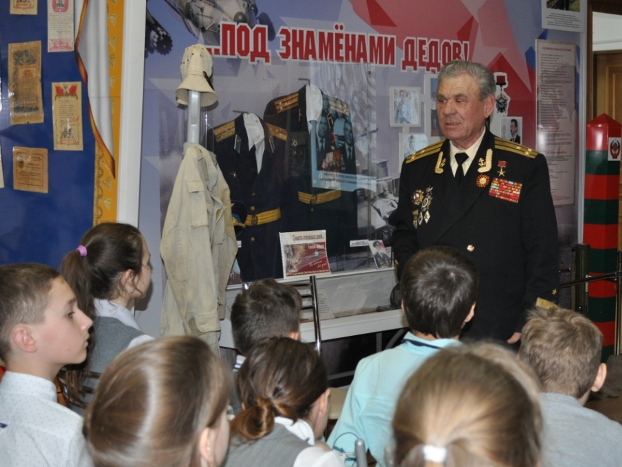 На урок мужества пришли пятиклассники школы № 8 и гость, сын героя войны - Николай Прокофьевич Лукьянов, капитан 1-го ранга, кандидат сельскохозяйственных наук, Герой Социалистического труда.