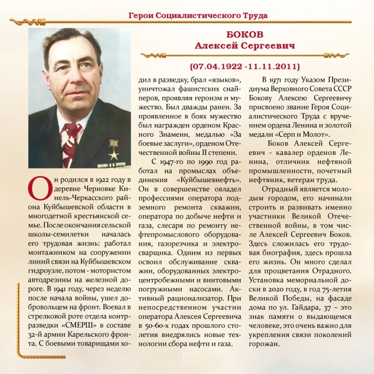 Всего в Отрадном проживали и работали шесть Героев Социалистического Труда и один полный кавалер орденов Трудовой Славы.