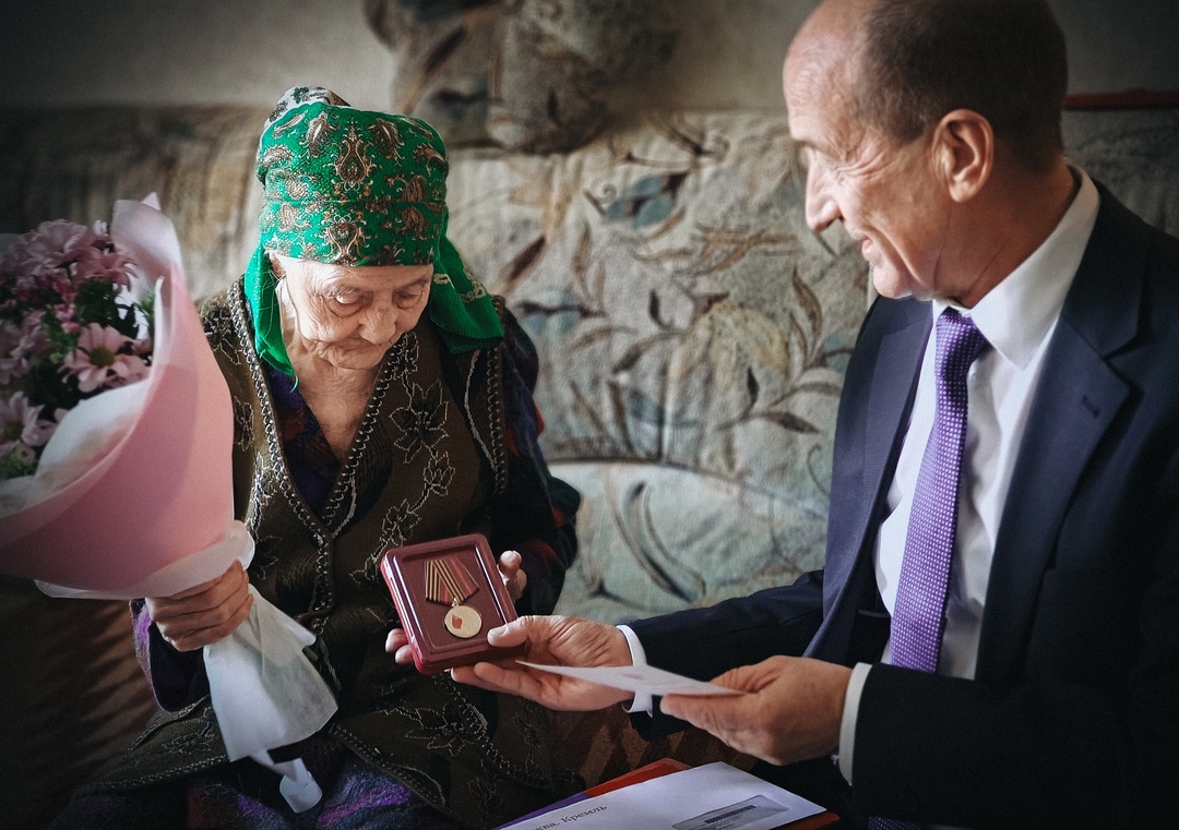 Ольга Сафиуловна приравнена к ветеранам Великой Отечественной войны. Градоначальник также исполнил почетную миссию, вручил имениннице юбилейную медаль «80 лет Победы в Великой Отечественной войне 1941–1945 гг».