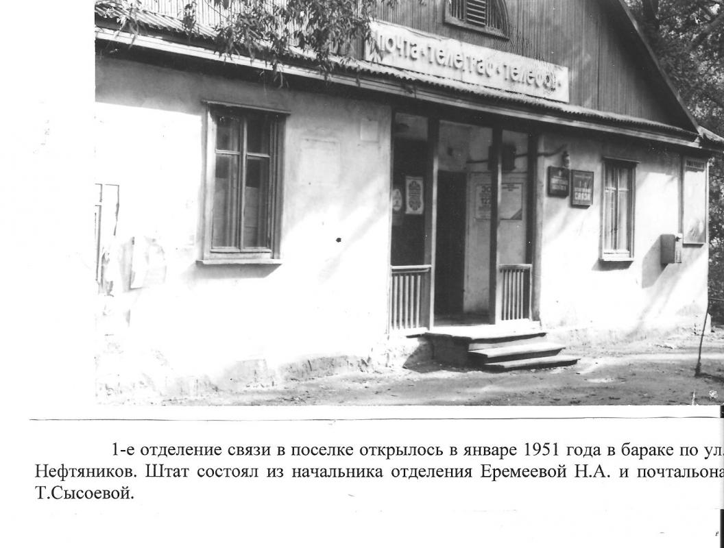 В далеком 1951 году в поселке нефтяников в бараке по ул.Нефтяников открылось первое отделение связи. Отделение, - конечно, звучит громко, ведь современники не поверят, что работали там начальник Н.А.Еремеева и почтальон Т.Сысойкина, т.е. всего два человека. Примитивными были условия и услуги, когда почту перевели в финский домик и увеличили штат до б человек. Но тогда это было событие. Первые жители поселка получили возможность пользоваться телеграфной связью. Здесь был установлен аппарат "Морзянка", который обслуживали первые телеграфистки Мария Павловна Фролова и Таисия Федоровна Воронина. В среднем, за день они принимали и отправляли по 20, а затем по 30 телеграмм.