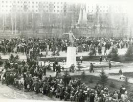В сорок вторую годовщину Великой Победы, 9 мая 1983 года, на новой площади был открыт памятник В. И. Ленину. В конце 90-ых здесь облик площади во многом определил первый главный архитектор Отрадного Б.Д. Семенов. Здесь построили фонтан. Он, как магнит, притягивал к себе всех жителей. За тридцать лет фонтан изменялся много раз.