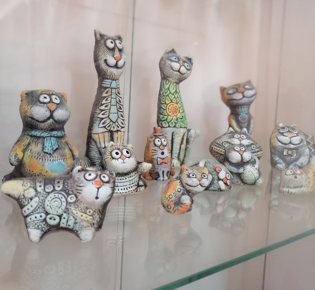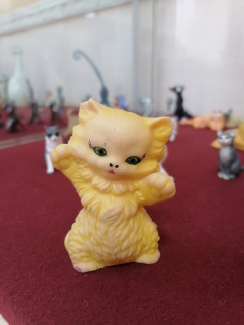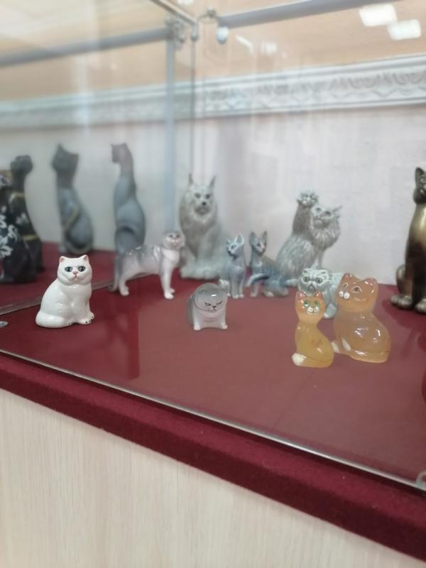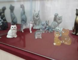 Фигурки кошек поражают своим многообразием. Кошек, котов и котиков на выставке представлено более 250 штук, разного размера и материала исполнения. Главный и самый ценный экспонат - советская резиновая игрушка – пищалка – милый котик, которого Эльвине в детстве подарил Дед Мороз за рассказанный стишок.