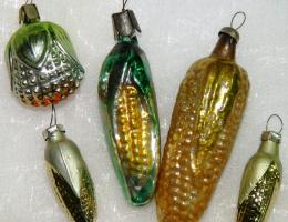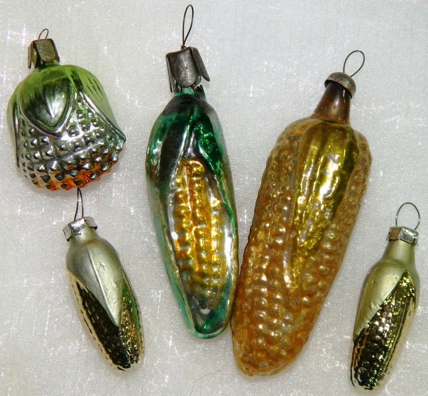Продовольственный кризис начала 50-х годов, вызванный неурожаями, неудачами в управлении сельским хозяйством, привел к появлению игрушек в виде овощей и фруктов. Они должны были символизировать изобилие в стране, когда по факту потребительская корзина советских граждан была весьма скудной. Также промышленность стала выпускать большой ассортимент игрушек, которые закреплялись на елке с помощью прищепок. С приходом к власти Хрущева аграрный кризис пытались преодолеть освоением целинных земель, а также насаждением кукурузы как основной кормовой и зерновой культуры. В 60-е годы на елках появились стилизованные початки «царицы полей».