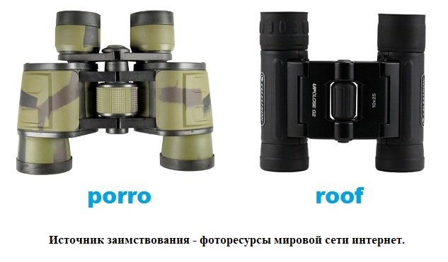 Бинокли с призмами «Руф» («roof») бывают двух видов - призма Аббе-Кенига и призма Шмидта-Пехана. Их система сложнее предыдущей. Одна призма полностью закрывает другую. Бинокли с такой оптикой более компактные, однако и более дорогие. Со дня изобретения бинокли менялись, становились совершеннее, лучше. Современные бинокли — призматические. Длина бинокля стала меньше за счет движения луча зигзагообразно, призмы переворачивают изображение (фото 6,7,8).