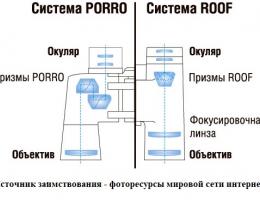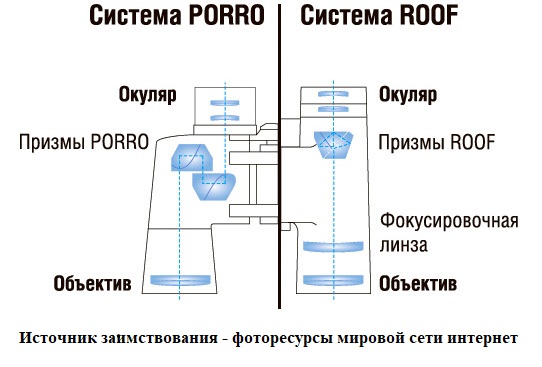 . Это даёт возможность использовать объективы большого диаметра, что важно для астрономических биноклей и для больших морских биноклей. В биноклях такого типа окуляр и объектив находятся на разных уровнях. К недостаткам системы Порро можно отнести относительно большую ширину бинокля (фото 4,5).