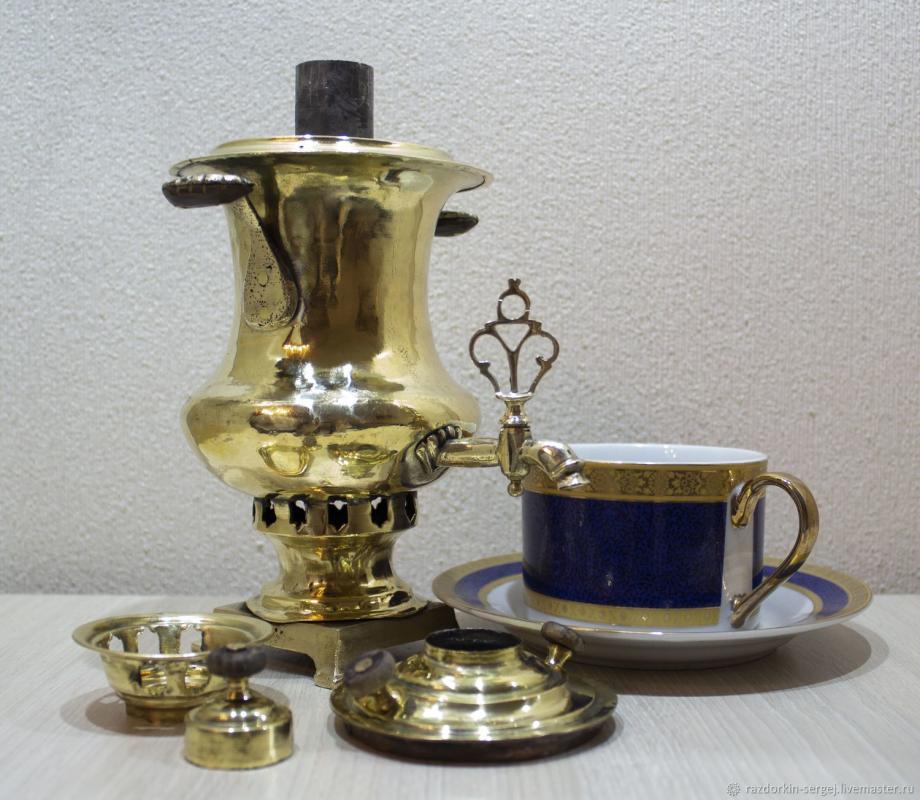 Самовар – металлический сосуд для кипячения воды и приготовления чая. Первоначально вода нагревалась внутренней топкой, представляющей собой высокую трубку, наполняемую древесными углями. Позже появились другие виды самоваров – керосиновые, электрические и пр.
