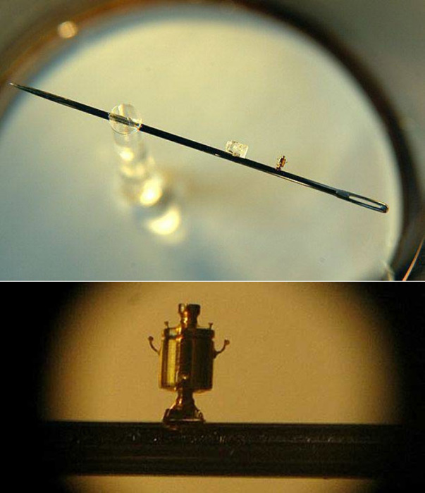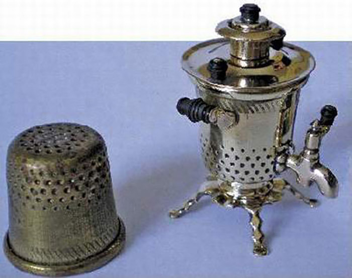 - Самый маленький самовар изготовил мастер миниатюры Н.Алдунин. Размер агрегата составляет 1,2 мм. Создан самовар из золота. Всего состоит из 12 отдельных деталей. Но самый маленький действующий самовар был сделан слесарем Института радиотехники и электроники АН СССР Василием Васюренко. В действующем самоварчике высотой 3,5 миллиметра можно вскипятить одну каплю воды.
