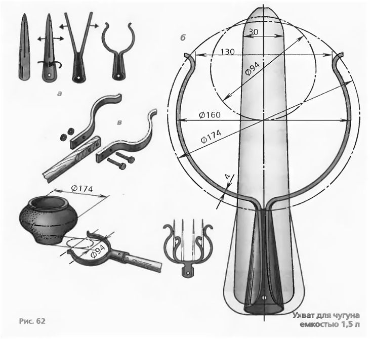 Строение ухвата состоит следующим образом. Рукоять вырезали из дерева. А ту часть, которой подхватывали чугун или горшок делали из железа. Как рассказывают знающие люди, ухват изготавливали в деревенской кузнице. Клинообразную пластину рассекали вдоль примерно на две трети её длины. Затем не рассечённую часть расковывали и заворачивали края так, чтобы образовалась коническая втулка, с помощью которой ухват насаживается на рукоятку. Полоски, полученные при рассечении заготовки, разводили в стороны и сгибали так, чтобы они образовали незамкнутое кольцо, диаметр которого зависел от размера чугунов и горшков. Расстояние между кончиками рогов должно быть таким, чтобы ухват можно было бы свободно подвести снизу под тулово чугуна или горшка. Кончики ухвата не должны царапать посуду, поэтому их слегка загибали в противоположные стороны.