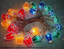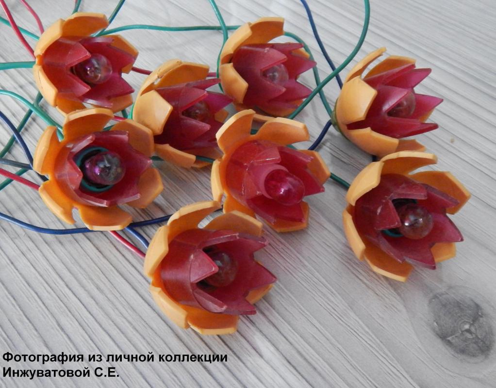 В конце 50-х годов появляются гирлянды из лампочек-фигурок: внутри фигурки из толстого стекла закреплялась нить накаливания, а сама фигурка вставлялась в цоколь, который был закреплен на проводе.
