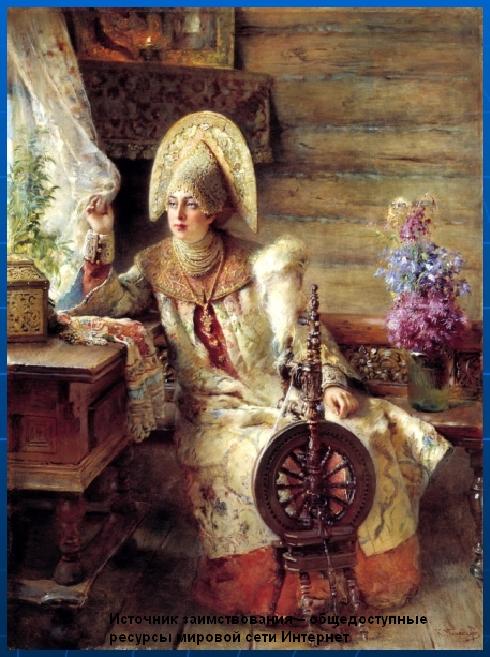 В Древней Руси были переносные прялки: к одному концу прикрепляли кудель, другой вставляли за пояс, и, придерживая пряслице локтем, женщина могла прясть стоя или даже на ходу.
