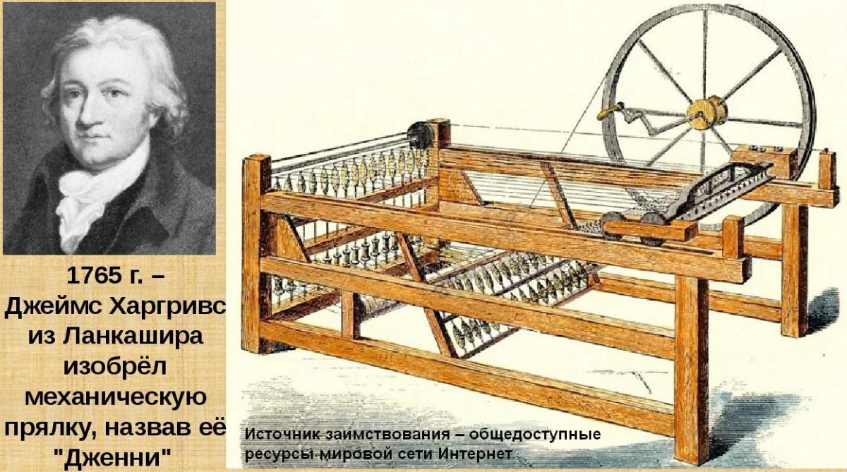 Первая прядильная машина, способная одновременно прясть не одну, а восемь нитей, была изобретена в 1764 г. британцем Джеймсом Харгривсом. По легенде, однажды его юная дочь Дженни, играя, опрокинула отцовскую прялку, и Джеймс заметил, что даже в горизонтальном положении колеса она продолжает работать. Это натолкнуло мужчину на мысль об изменении конструкции прибора. Свою механическую прядильную машину Харгривс назвал в честь дочки - «Дженни». Вскоре его изобретение стало настолько популярным, что обозленные ткачи из его города сожгли дом изобретателя. Но Харгривс с семьей перебрался в другое место, запатентовал свою «Дженни» и работал над ее усовершенствованием. Так, к концу жизни Джеймса, у его «Дженни» было уже восемьдесят веретен и в движение ее приводил уже не человек, а гигантский водяной двигатель.