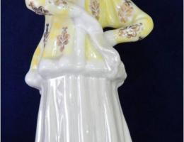 Статуэтка "Лебёдушка в желтом". Изготовитель: Дулёвский фарфоровый завод. Время создания: 1966 г. Материал: фарфор. Статуэтка "Лебёдушка в желтом". Фигура танцующей девушки в полный рост, в правой руке платок, левая рука на поясе, голова склонена вправо. Одета в белую длинную юбку и желтую шубку, на голове кичка с понизью. Дулёвский фарфоровый завод, скульптор А.Д. Бржезицкая. Клеймо завода - графическое изображение птицы – сокол.