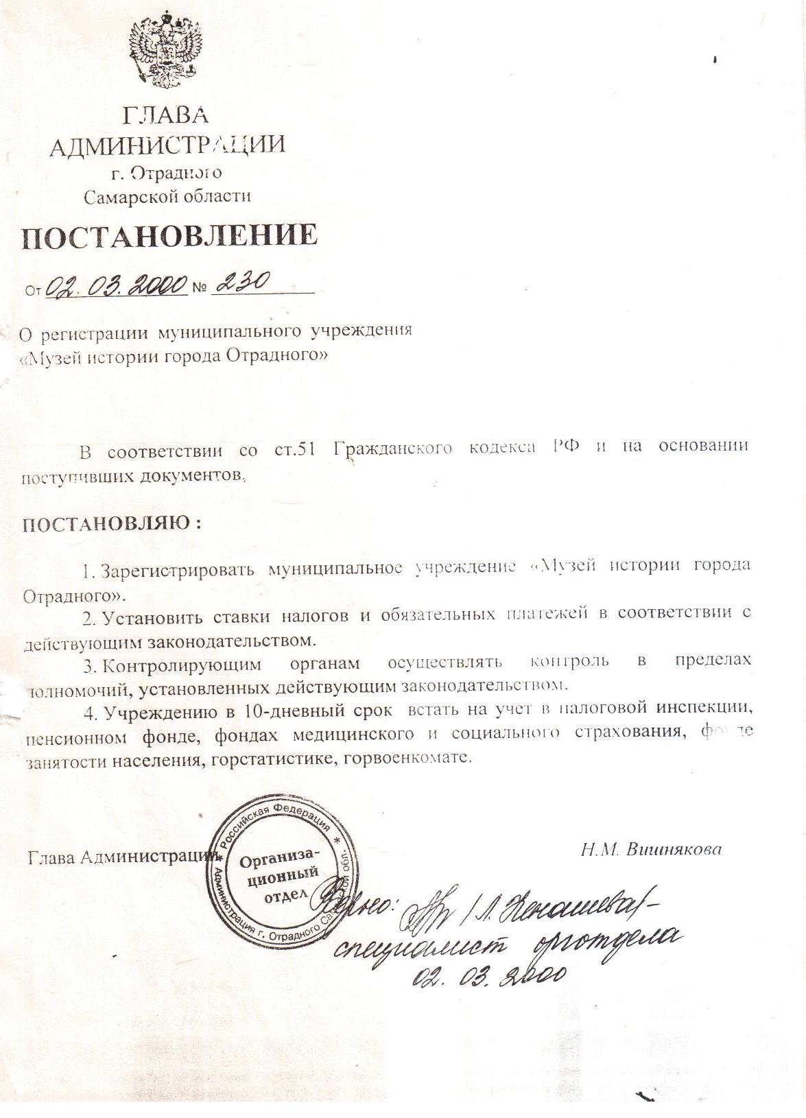 Постановление о регистрации МУ "Музей истории г. Отрадного"