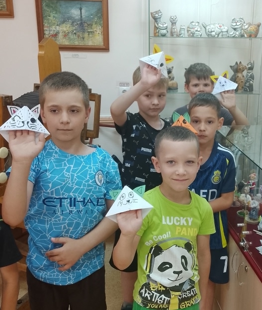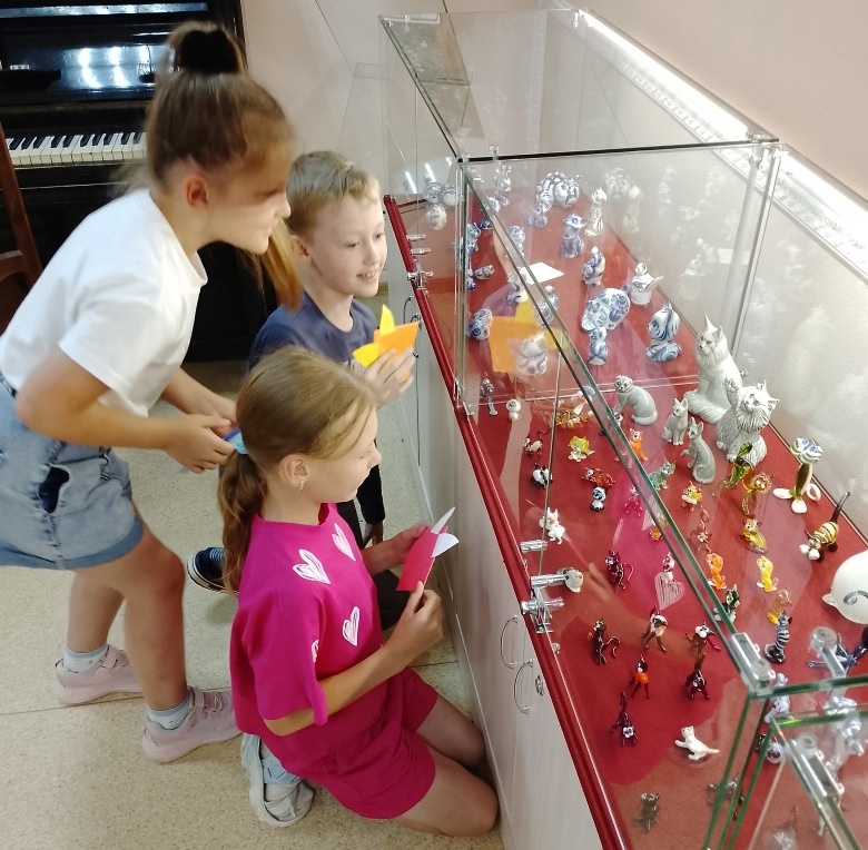 Ребята из летнего лагеря «Данко» с умилением послушали рассказ экскурсовода Писчасовой М.В. о кошках и разнообразии их профессий. Узнали много интересных фактов про усатиков - полосатиков, с большим интересом участвовали в играх и конкурсах, вспомнили клички кошек и котов - героев сказок.