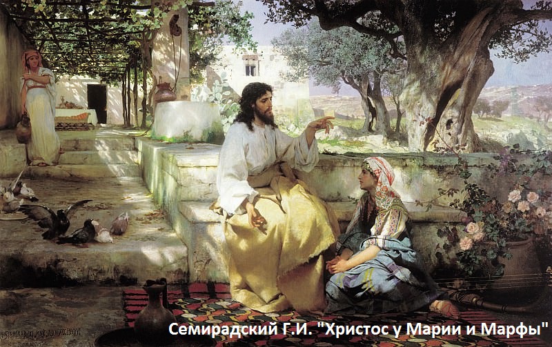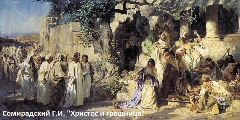 И снова произведение Генриха Ипполитовича Семирадского «Христос и грешница (Кто из вас без греха?)» (1886-1887 гг., Государственный Русский музей, Санкт-Петербург). Евангелие от Иоанна 8:3-11: «Тут книжники и фарисеи привели к Нему женщину, взятую в прелюбодеянии, и, поставив ее посреди, сказали Ему: Учитель! эта женщина взята в прелюбодеянии; а Моисей в законе заповедал нам побивать таких камнями: Ты что скажешь? Говорили же это, искушая Его, чтобы найти что-нибудь к обвинению Его. Но Иисус, наклонившись низко, писал перстом на земле, не обращая на них внимания. Когда же продолжали спрашивать Его, Он, восклонившись, сказал им: кто из вас без греха, первый брось на нее камень. И опять, наклонившись низко, писал на земле. Они же, услышав [то] и будучи обличаемы совестью, стали уходить один за другим, начиная от старших до последних; и остался один Иисус и женщина, стоящая посреди. Иисус, восклонившись и не видя никого, кроме женщины, сказал ей: женщина! где твои обвинители? никто не осудил тебя? Она отвечала: никто, Господи. Иисус сказал ей: и Я не осуждаю тебя; иди и впредь не греши».