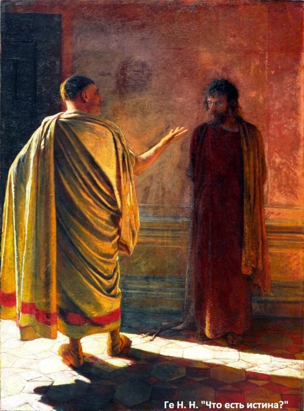Еще одно произведение Николай Николаевич Ге - «Что есть истина» (1890 г., Государственная Третьяковская галерея, Москва). В 1889 году Николай Ге задумал картину «Что есть истина? Христос и Пилат», представляющую собой живописную версию 18-й главы Евангелия от Иоанна. Иисус и Пилат написаны Ге с непривычной для конца XIX века остротой. Пилат с его выразительным, мощным затылком и широкой спиной показан властным римлянином, самоуверенным сибаритом. Он обращает свой вопрос к обвиняемому без ярости или злобы, с высокомерной насмешкой. Пилата вряд ли интересует ответ на его вопрос «Что есть истина?» – он уверен, что знает его и сам. Между ним и Христом пролегает луч света, разделяющий их, подобно мечу; это напоминает о других словах Христа: «Не мир пришёл Я принести, но меч»(Мф. 10:34).