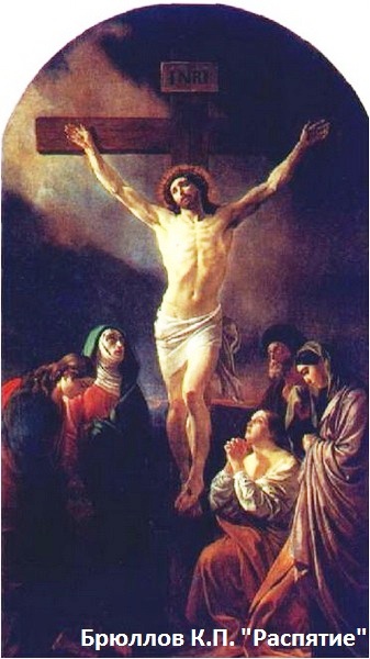 Очень трагично полотно Карла Павловича Брюллова «Распятие» (1840-е гг., Государственный Русский музей, Санкт-Петербург). И печальны слова Библейского писания: «При кресте Иисуса стояли Матерь Его и сестра Матери Его, Мария Клеопова, и Мария Магдалина». (Евангелие от Иоанна 19:25).