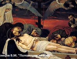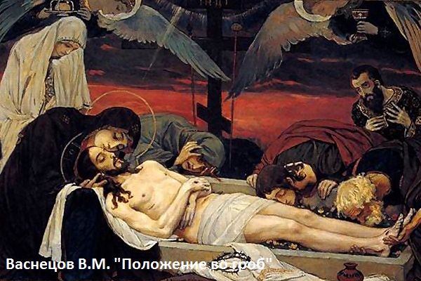 Мы знаем великого русского художника Виктора Михайловича Васнецова (1848-1926) больше по его былинным и сказочным картинам. Но писал он и библейские сюжеты. Исполненная трагизмом картина «Положение во гроб» написана художником в 1896 г. ( Государственный Русский музей, Санкт-Петербург). Сцена оплакивания Христа описана подробно в Евангелие от Луки 23:50-55. «Тогда некто, именем Иосиф, член совета, человек добрый и правдивый, не участвовавший в совете и в деле их; из Аримафеи, города Иудейского, ожидавший также Царствия Божия, пришел к Пилату и просил тела Иисусова; и, сняв его, обвил плащаницею и положил его в гробе, высеченном [в скале], где еще никто не был положен. День тот был пятница, и наступала суббота. Последовали также и женщины, пришедшие с Иисусом из Галилеи, и смотрели гроб, и как полагалось тело Его».