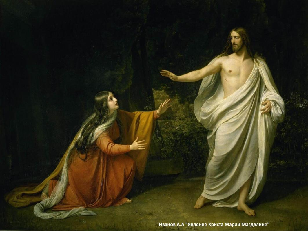 Еще одна знаменитая картина Александра Андреевича Иванова «Явление Христа Марии Магдалине» (1833 – 1835 гг., Государственный Русский музей, Санкт-Петербург). За основу живописного произведения художник взял распространенный евангельский сюжет явления Иисуса Марии Магдалине. Благодаря темному фону и фронтальному расположению фигур, Иванову удалось добиться эффекта присутствия зрителя, будто наблюдающего за этим чудесным событием. Художник не стал изображать ничего лишнего, чтобы не отвлекать смотрящего от двух важных персонажей - Христа и Магдалины. От Иисуса Христа словно исходит сияние, что подчеркивается белыми драпировками савана. Его образ исполнен величия и кажется неземным. Останавливающий жест руки строг и полон любви. «Не прикасайся ко мне, ибо я еще не взошел к Отцу моему», - говорит он склонившейся Марии Магдалине. Женщина протягивает к Спасителю руки, опустившись перед ним на одно колено. Художник смог изобразить радость сквозь слезы на ее изумленном лице. Только что она плакала, не обнаружив тело Учителя в гробнице, и вот, Он сам стоит перед ней.