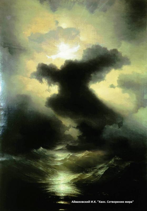 Иван Константинович Айвазовский (1817-1900) работал не только в маринистическом жанре, но и создавал произведения на библейскую тему. Таких произведений у него несколько. Одно из самых знаменитых «Хаос (Сотворение мира)» создано в 1841 г.