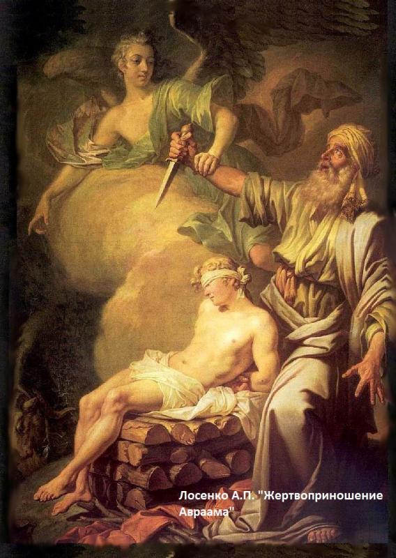 Антон Павлович Лосенко (1737-1773) известен как художник исторического жанра, в творчестве которого не обошлось без библейских сюжетов. Картина «Жертвоприношение Авраама (Авраам приносит в жертву сына своего Исаака)» создана в 1765 г., находится в Государственном Русском музее в г. Санкт-Петербург.