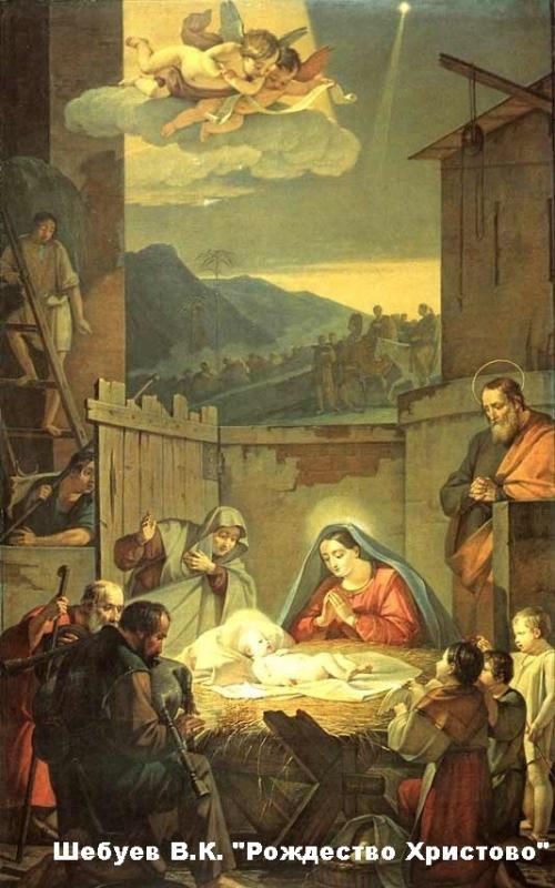 Василий Кузьмич Шебуев (1777-1855) написал картину «Рождество Христово» в 1847 г. для Благовещенской церкви Конногвардейского полка в Петербурге. В ней мы видим легендарное поклонение пастухов младенцу Христу.