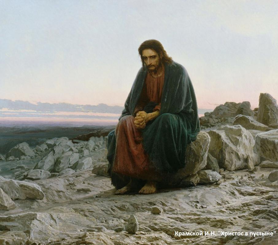 Иван Николаевич Крамской (1837-1887), мастер портретного жанра, написал «Христос в пустыне». (1872 г., Государственная Третьяковская галерея, Москва).В картине Крамского пустыня производит впечатление холодного ледянящего пространства, в котором нет и не может быть жизни. Могучая вертикаль словно окаменевшей от дум фигуры Христа противостоит бесконечной шири пустыни. В его лице, особенно во взгляде, полном напряженной мысли, читается некая отрешенность, отсутствие реальности здешнего мира. Он изображен спиной к розовеющему горизонту, он может только угадывать восход. Утро возрождения наступило, но солнце еще не встало...