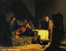 Одно из самых известных произведений мастера исторического жанра Николая Николаевича Ге (1831-1894) - «Тайная вечеря» (1863 г., холст, масло. Государственный Русский музей, Санкт-Петербург). Перед зрителем предстает скромная полутемная комната, полная людей. Главный персонаж – Иисус Христос – полулежит на низком ложе с валиком, рядом с ним коленопреклоненный Иоанн, самый молодой его ученик, а с другой стороны – апостол Петр. Остальные апостолы столпились за спиной Христа. На переднем плане полотна в углу – темный силуэт. Это фигура Иуды Искариота, которому Христос сказал, что знает о его предательстве. Встревоженные ученики не поняли иносказания, но Иуда точно знал, о чем идет речь. Для Ге он не был простым предателем, продавшим своего учителя за деньги. Это идейный соперник, человек, не принявший истинности учения Христа.