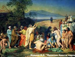 Александр Андреевич Иванов (1806 - 1858) двадцать лет своей жизни посвятил созданию монументального произведения «Явление Христа народу» (1837 – 1857 гг. Государственная Третьяковская галерея, Москва).Эта картина стала делом всей его жизни. К картине было написано около 600 этюдов. Первым полотно «Явление Христа народу» увидела вдовствующая императрица Александра Федоровна. Огромное полотно размером 540х750, сияя красотой, стояло у стены в окружении сотни эскизов. Весной 1858 года Иванов привозит полотно в Санкт-Петербург из Италии. Император Николай Первый решил встретить картину по-царски и распорядился выставить ее для обозрения публики прямо в Зимнем дворце.