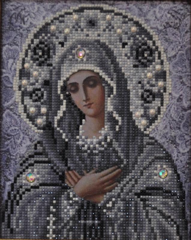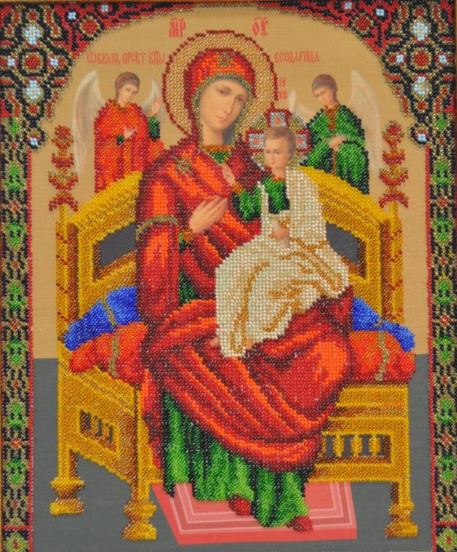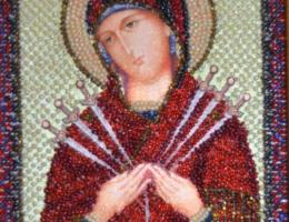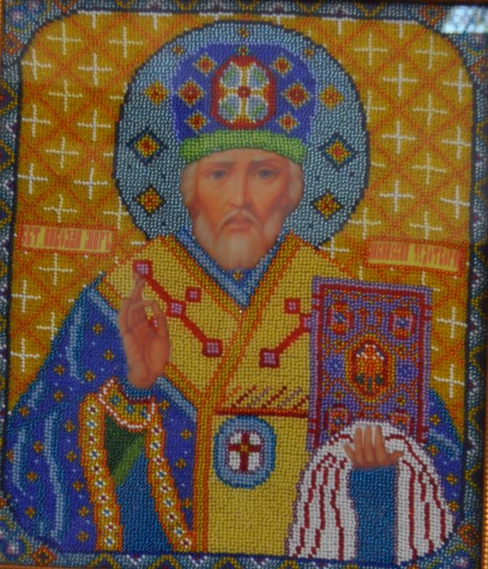 На выставке «Вышитое чудо» в первую очередь привлекают внимание иконы Елены, вышитые бисером. Их много и они вышиты аккуратно, в красивом колорите, грамотно оформленные в багет. По словам Елены, для душевного спокойствия после смерти матери она увлеклась вышивкой бисером икон.