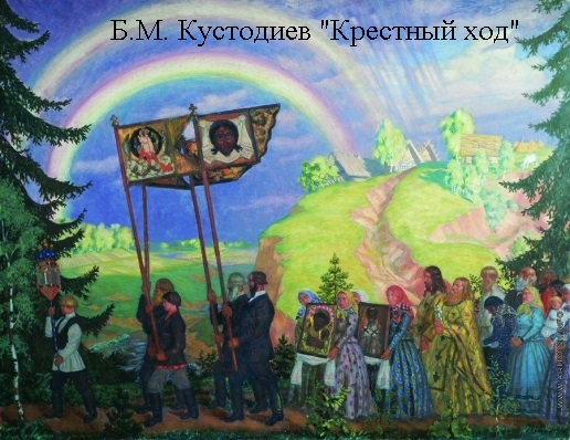 Русские художники не раз обращались к теме крестного хода. Кустодиев трактует крестный ход как типично русский театрализованный обряд, как шествие из какой-то стародавней сказки. Интересно, что в эскизе не было ни дождя, ни радуги. В картине художник послал на землю благодатный дождь, перекинул через небо радугу—доброе знамение. Она завершила весь композиционный строй картины, — хоругви с изображением Спаса точно вписываются в ее полукруг. Между ликом божьим и небесным явлением устанавливается некая зависимость. И художник сознательно подчеркивает ее. Случайное совпадение воспринимается, словно бы с точки зрения усердствующих во имя бога мужичков, как чудо. Но не верой ли в чудо жива «матушка Расея»? Изображенные в картине фигуры своей поступью, каждым своим шагом как бы возглашают: «тем и стоим!».