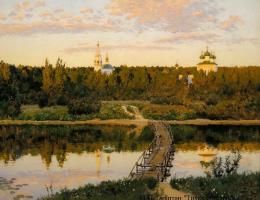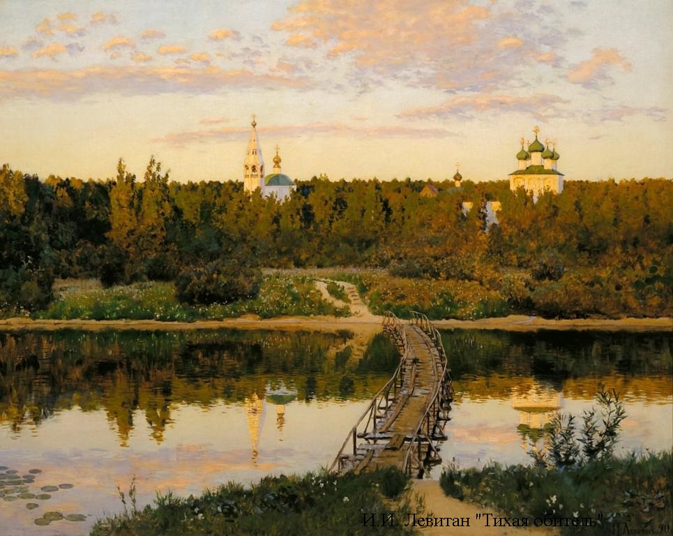 Тридцатилетнему Исааку Левитану его «Тихая обитель» снискала громкую славу. Именно после неё о Левитане заговорили не просто как о состоявшемся художнике – как о мэтре и выразителе национального духа. Тихий благостный вечер опускается на реку и перелесок, скрывающий в своей зелени небольшой скит. Краски прозрачны и чисты – можно даже на минуту ошибочно решить, что перед нами ранее утро. Через речку тянутся шаткие деревянные мостки. Кажется, перейдёшь по ним, очутишься под сенью древнего монастыря – и все напасти и печали, всё грешное и суетное останется далеко позади. В тревожные десятилетия безвеременья «Тихая обитель» воспринималась как редкий символ «русской благодати».
