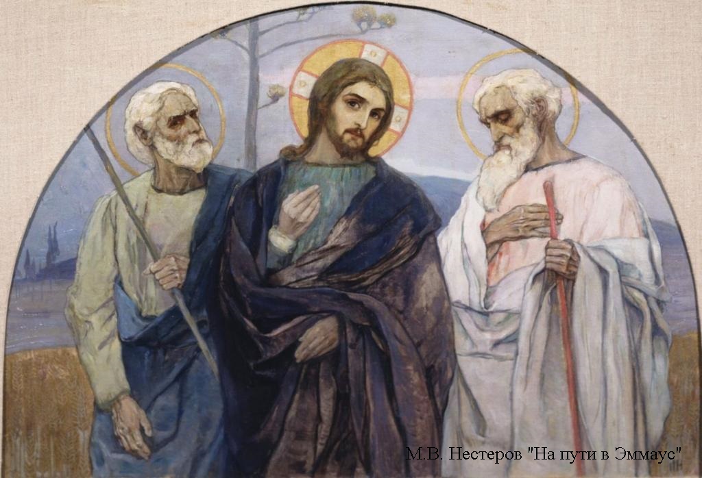 Эскиз мозаики «На пути в Эммаус» был создан для резного иконостаса храма Спаса на Крови — одной из главных достопримечательностей этого собора. Эскиз написан художником в духе стиля модерн, который проявился в сдержанном, неярком колорите, простой, гармоничной и выверенной композиции. Сюжет произведения описан в последней главе Евангелия от Луки, где сказано, что два ученика Иисуса Христа после Его распятия на Голгофе шли из Иерусалима в Эммаус. К ним в пути присоединился воскресший Христос, но они не узнали Его. В центре композиции помещены три фигуры путников на фоне классического «нестеровского» пейзажа — тонкое деревце и жемчужно-розовый закат. Христос изображен в центре с нимбом, ученики расположены по сторонам от Спасителя, их нимбы намечены тонкой золотистой линией. Христос взглядом и благословляющим жестом обращен к зрителю, два седовласых старца обращены к Христу, но при этом не смотрят на него. Персонаж слева как бы прислушивается к словам Спасителя, сомневаясь в своих чувствах. Старец справа склоняет перед ним голову, его правая рука поднесена к груди— этот жест трактуется в иконописи как принятие и смирение. Нестеров являет момент узнавания учениками своего учителя.