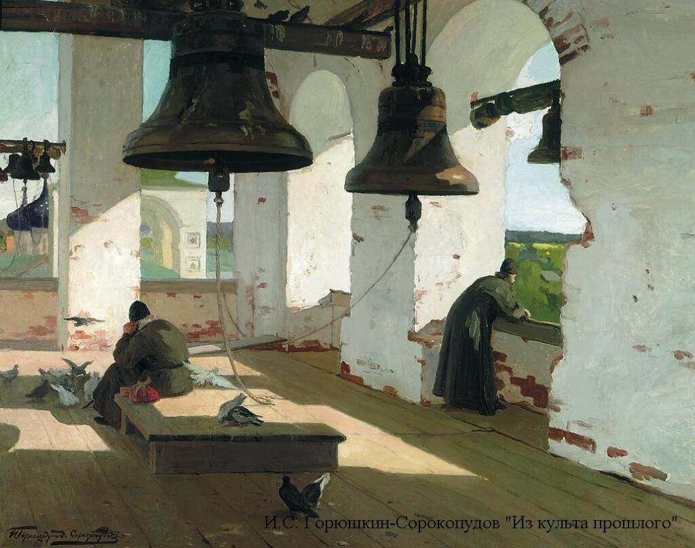 Изучая историю и быт Руси, художник совершал неоднократные поездки в Углич и Ростов. Впечатления от этих поездок отражены в многочисленных этюдах. Своеобразным обобщением этих впечатлений явилась картина «Из культа прошлого», имевшая авторское название «Из века в век», не пугаясь присутствия людей в черных монашеских одеждах. Неторопливо течет здесь жизнь. Зима сменяет осень, лето – весну. И так из века в век. Солнечные лучи привлекают к фигуре монаха, беседующего с голубями. Другой, стоящий навстречу солнцу, вглядывается в беспредельные просторы. Колокольный звон – это музыка души русского человека, неотъемлемая часть его бытия. Она могла выражать радость и грусть, тревогу и торжество и всегда благотворно влияла на людей. Тема колоколов и колокольного звона прошла лейтмотивом через все творчество этого художника.