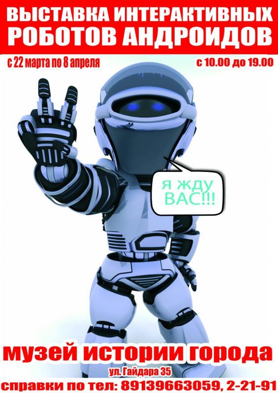 Музей истории города Отрадного приглашает жителей и гостей города с 22 марта по 8 апреля с 10-00 до 19-00 на новую уникальную выставку интерактивных роботов-андроидов. На выставке «оживут» роботы с множеством датчиков, моторов и приводов. Роботы могут видеть, слышать и даже заговорить с посетителями. Можно будет подготовить пру вопросов железным человечкам. Экспонаты могут чувствовать прикосновения людей и реагировать эмоционально!