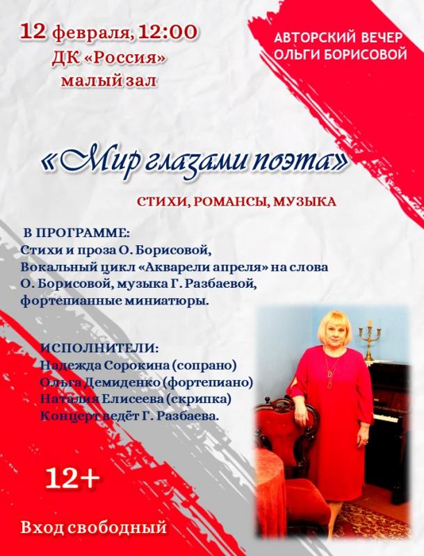 Дорогие друзья! Приглашаем Вас 12 февраля в 12-00 в малый зал Дворца культуры "Россия" на творческую встречу с поэтом, переводчиком, писателем, публицистом, общественным деятелем Ольгой БОРИСОВОЙ. Ольга Михайловна - член Союза писателей России. Автор 13 книг поэзии, прозы и публицистики, а также на её стихи издан сборник романсов (ком. Г. Разбаева). Победитель и призёр различных международных фестивалей и конкурсов в Чехии, Болгарии, Германии, Франции, Белоруссии, Украине, Литве и России. Лауреат нескольких международных премий. Стипендиат министерства культуры РФ.