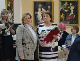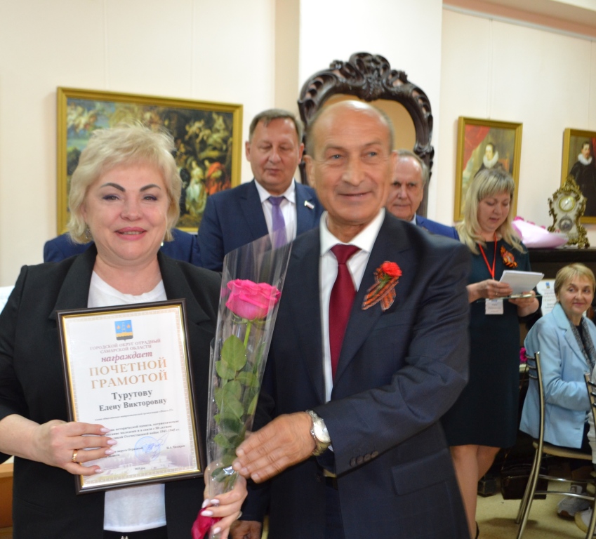 Глава городского округа Владимир Александрович Чихирев В.А. наградил нагрудным знаком «За заслуги перед городом» за сохранение исторической памяти, патриотическое воспитание молодежи и в связи с 80-летием Победы в Великой Отечественной войне 1941-1945 гг. ветерана педагогического труда, члена Совета муниципального бюджетного учреждения культуры «Музей истории города Отрадного" "Голубеву Зою Ивановну.