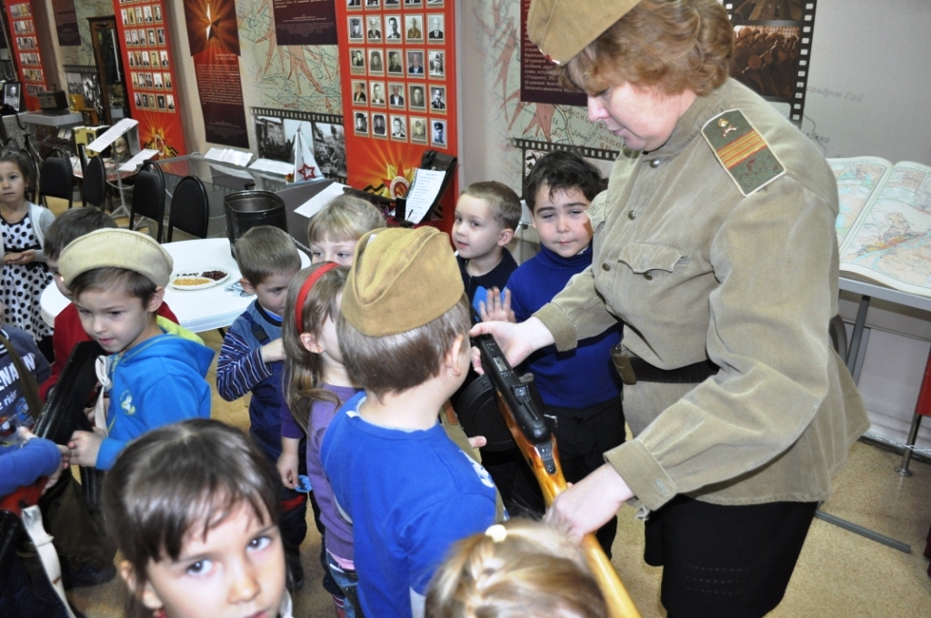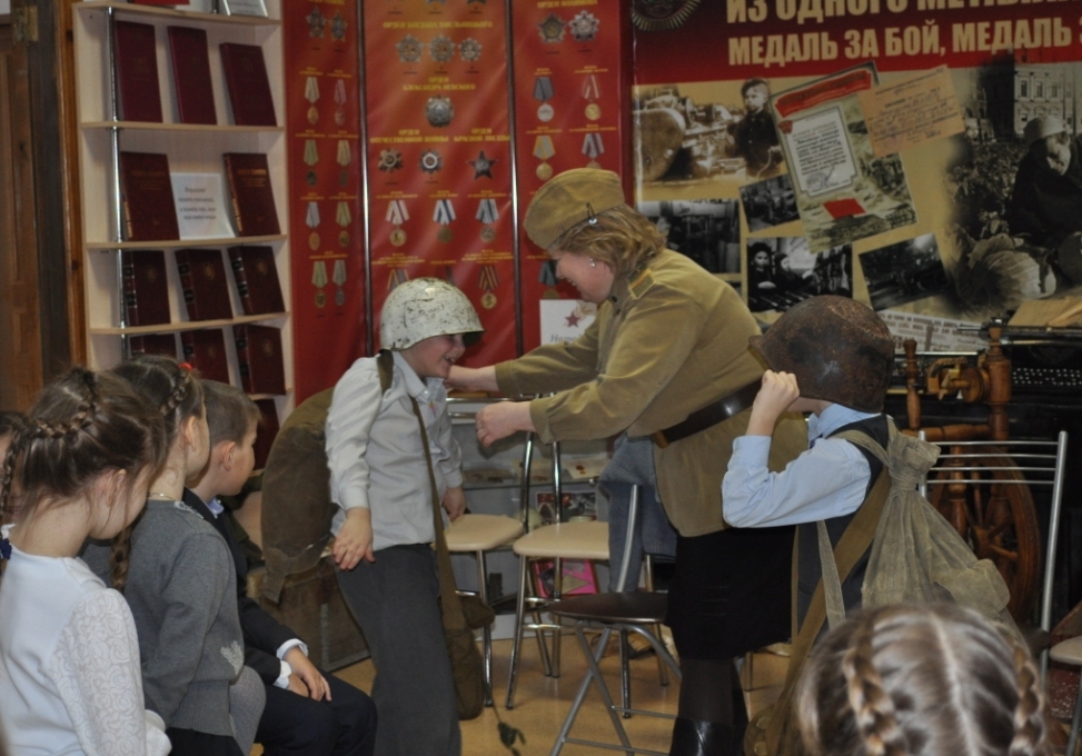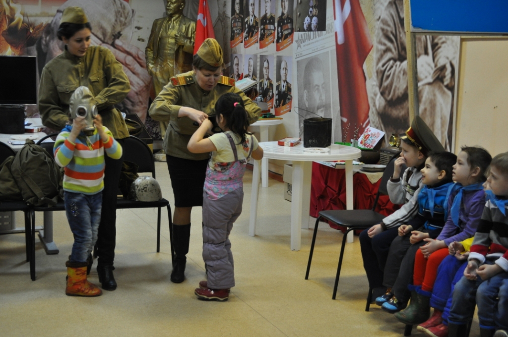 Экскурсовод: Как называются предметы, которые находятся здесь в музее? Противогаз — средство защиты органов дыхания, зрения и кожи лица. Солдатская каска — средство индивидуальной защиты, защитный шлем военнослужащих. Вещмешок - специальная сумка в виде мешка из брезента (парусины и так далее) цилиндрической или другой простой формы с клапаном в верхней части. Обычно закрывается с помощью затягивающего шнура, клапана или ремня.