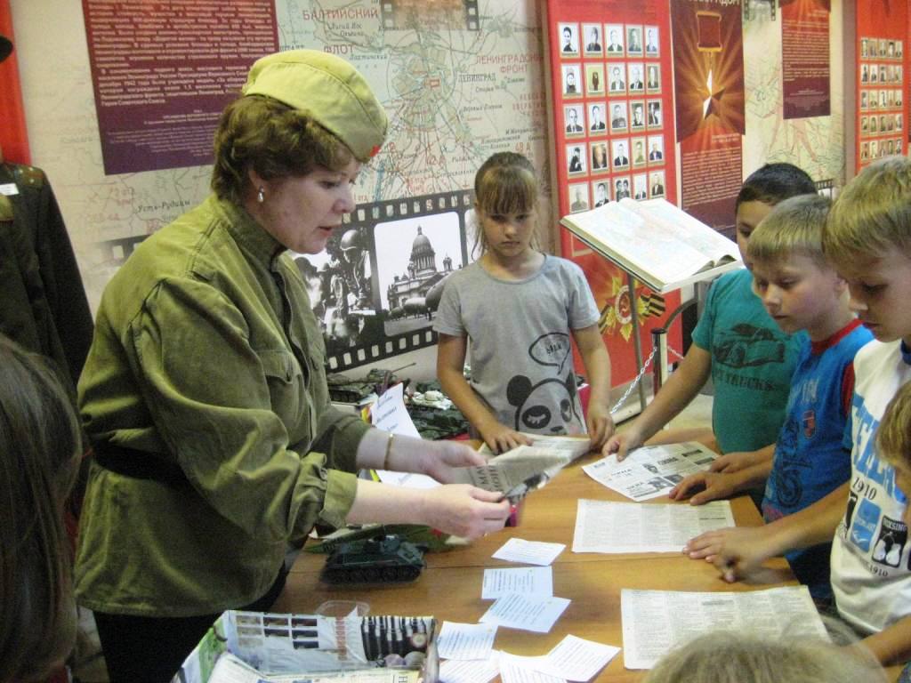 Экскурсовод: Разведчики, равняйсь, смирно! Поздравляю вас с 75-летием Великой Победы и окончанием «Школы разведчиков». Подсчитываются трофеи и подводятся итоги игры. На память об участии в программе юным разведчикам вручаются эмблемы "Школы разведчиков".