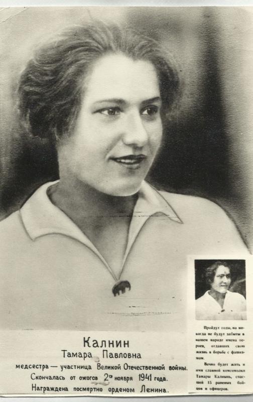 Подвиг медиков в годы Великой Отечественной Войны сложно описать. И совершенно невозможно перечислить всех поименно. 16 сентября 1941 года медсестра Тамара Калнин проводила эвакуацию раненых в госпиталь. По дороге санитарную машину обстрелял фашистский самолёт. Шофёр был убит, машина загорелась. Тамара Калнин вытащила всех раненых из машины, получив серьёзные ожоги. Добравшись пешком до медсанбата, она доложила о случившемся и сообщила о местонахождении раненых. Позже Тамара Калнин умерла от ожогов и заражения крови.