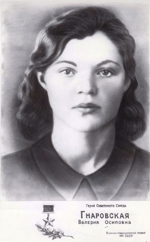 И третья героиня - Валерия Гнаровская. Осенью 1943 года велись бои на берегу Днепра. Немцы были выбиты из деревни Вербовая. Рота солдат выдвинулась из деревни, но попала под пулеметный огонь. Гитлеровцы отступили, но среди советских солдат было много убитых и раненых. Разбив Для раненых были разбиты палатки до отправки их в госпиталь. И войска двинулись дальше. С ранеными осталась Валерия Гнаровская. На рассвете ждали машины с красным крестом, но с восходом солнца из тыла появился фашистский танк «тигр». Гнаровская, недолго думая, собрала у раненых сумки с гранатами. Увешанная ими, она кинулась под гусеницы. Валерия погибла, но ценой собственной жизни спасла 70 раненых бойцов.