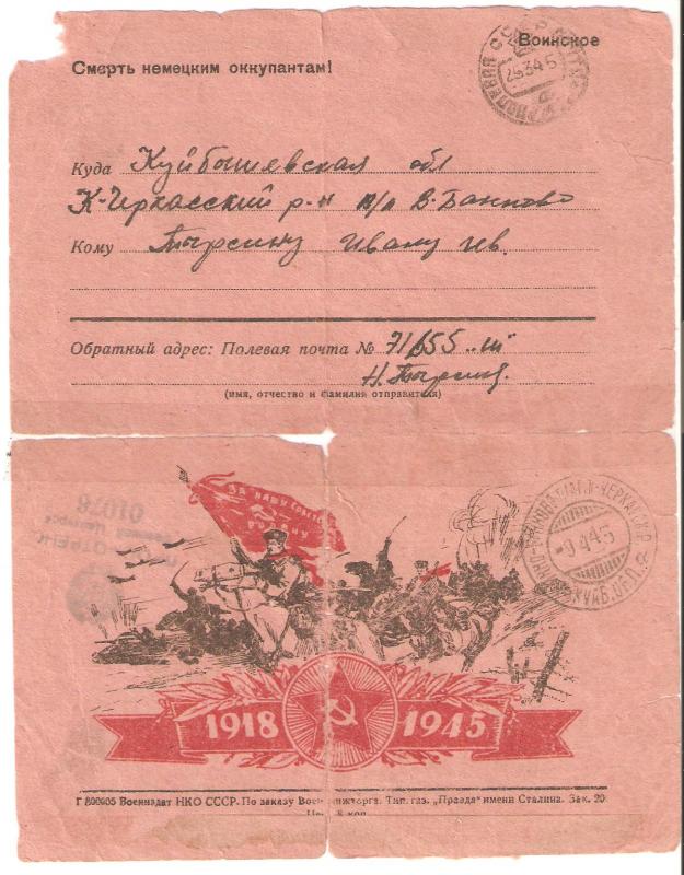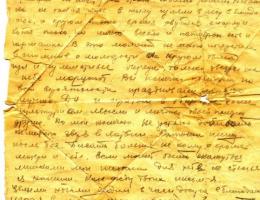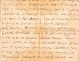 Шлю я вам красноармейский привет и желаю всего хорошего в вашей жизни, а главное здоровье. Во-первых строках моего письма я сообщаю, что я ваши посылки получил, за что благодарю. В посылке было все цело и яйца были целые, не протухли. Стеша, только ты не угадала положить масло, это для меня было бы лучше, и денег маловато, а то без денег везде плохо, ну да ладно, спасибо и на этом. Я посылку получил 22 числа и в этот день для меня был праздник. Сухари до сих пор есть. Стеша, а из письма понял, что ты убрала огород благополучно. Но только одно что плохо с дровами. И в колхозе не дают хлеба, а может дадут, а насчет поросенка я тебе так посоветую, если тяжело тебе держать, тогда зарежь и ешьте его с Витей. И вспоминайте про меня, как я любил и как мечтал закоптить окорок, но не пришлось. Похоже и за меня закоптят окороки, а не я. Но ничего не сделаешь такая участь моя несчастная