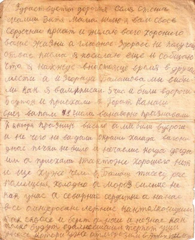 Ну, а к военному делу стал немного привыкать, хотя и трудно, но некуда деваться. Нахожусь я в телеграфной связи, занимаемся с 6 часов утра и до 10 вечера, ложимся спать в 11 часов, встаем в 5 утра, заснуть очень трудно, устаем, много ходьбы, да все бегом, а насчет питания все по старому, как я и писал, только из редка урываешь железно дарж столовое, но денег немного приходится беречь. В дальнейшем Стеша, 4 числа уедем из г.Балаш, но не известно куда… поглядывай на станцию, возможно поедем мимо. Стеша, я вам послал две фотокарточки, хотя и неважные, ну да ладно, а как живут все мои родственники, и как растет сынок Витя? Наверное ему скучно без меня и часто вспоминает про меня. Когда я прочитал письма, а потом увидел написанное еще что то и узнал, что это писал Витя, я не мог удержаться, плакал. Эх, Стеша, как мне его жалко.