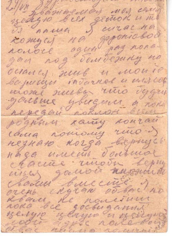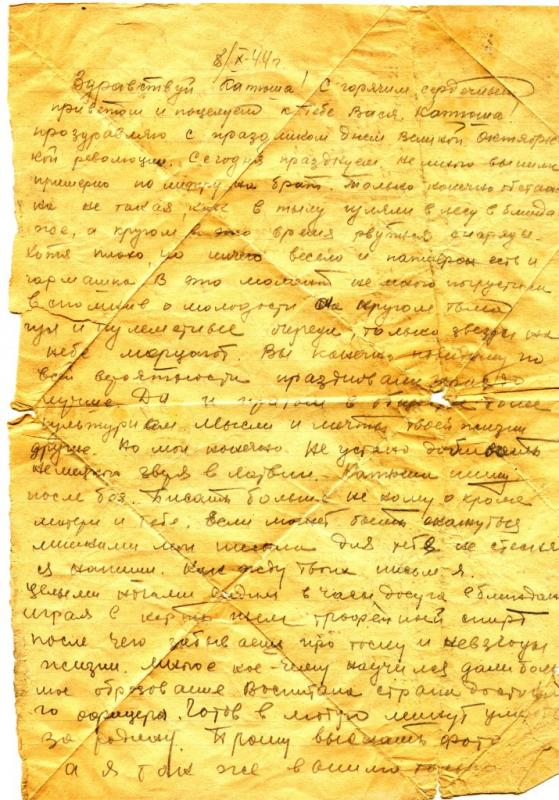 Здравствуйте многоуважаемые Стеша и Витя. Шлю я вам свой фронтовой привет и тысячу наилучших пожеланий. Во-первых строках моего письма я вам сообщаю, что я жив и здоров того и вам желаю. Ответа я от вас не получил на те письма почему это так или же вы не пишите вы больше лишнее письмо написать только на письмо отвечаете и то не на каждое я думаю что вы скорее выберете время написать, чем я, вот так Стеша. Я бы вас просил, пишите чаще пока я жив, а то бы написала и время нашла бы, да не кому будет. А моя жизнь такова даже письма не могу дописать, как может срезать немецкая злодейка пуля, а они визжат над головой каждую минуту и стервятник вьется надо мной и мины рвутся и снаряды рядом со мной, ну а мне все таки хочется сообщить вам, а то и так долго не писал да и вы не пишите. Стеша, вы о том знаете, что мы в нынешнее лето не сидим, а гоним немца со своей земли и освобождаем своих матерей и детей и братьев и сестер, а еще мы проходим населенные пункты и города. Так нас встречают, так рады, так описать не могу, а особенно рады в городах, которые мы освободили. Мы праздновали вместе с народом, они нас встречали и даже дети, и давали подарки, кто что мог, а солдату что надо? Кушать да покурить. Вот и все Стеша, я имею большое счастье в нынешнем году ввиду того, что зелени покушал всякой, даже груш, в общем всего, а для меня это большое дело не как прошлым летом не видали ничего акромя картошки. Передавай привет всем родным и знакомым.