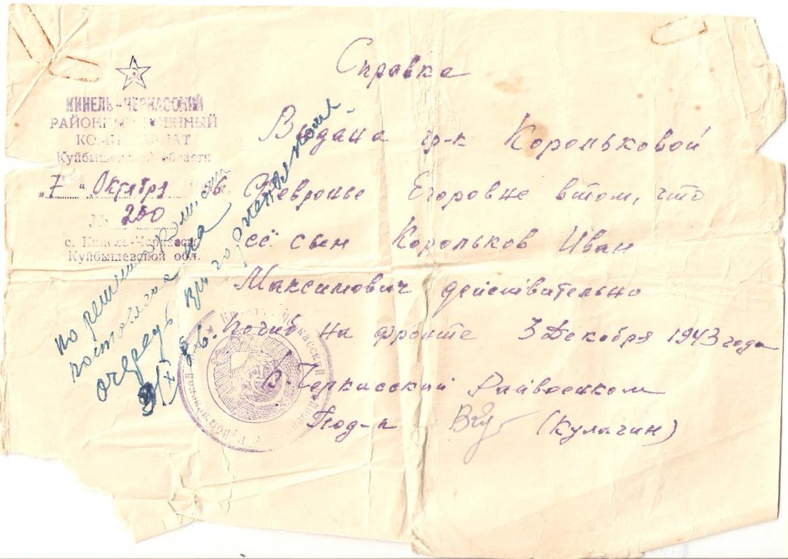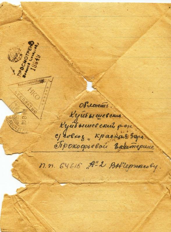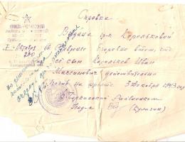 Письмо пущено 10/12/1943 года от Домбровского Сергея Ефимовича – Скрябневой Софии.